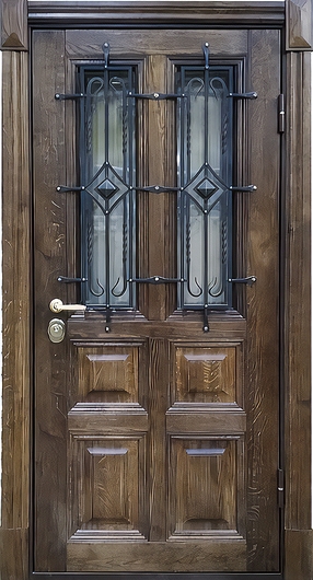 Входная остекленная дверь с массивом и накладной ковкой — подойдёт тем, кто ценит качество и натуральные материалы. Панели из массива дерева гармонируют с цветовой палитрой фасада и внутренней отделки. Оформление придаёт двери завершённый и премиальный облик.