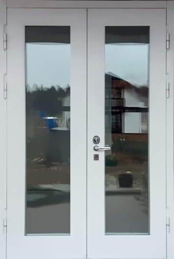 Двустворчатая стальная дверь белого цвета со стеклопакетами КД-486
