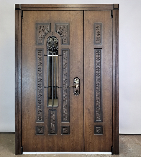 Полуторная термодверь МДФ со стеклом и ковкой — выбор тех, кто ищет надёжную и эстетичную входную дверь. Панели из МДФ легко очищаются, не требуют сложного ухода и сохраняют презентабельный вид на протяжении многих лет. Формируют целостный образ входной группы. Оформление подойдет для домов с классическим и современным оформлением.