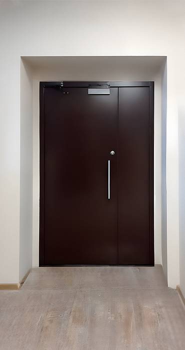 Дизайн двери для подъезда многоквартирного дома лаконичен. Большинство покупателей предпочитают глухое полотно без декоративных деталей. Снаружи полотно окрашивают антикоррозийной порошковой краской.